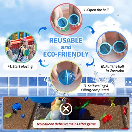 - 【Magnetic Self Sealing & Fast reload】You just need to open this magnetic water ball and put it into the water, it will be filled and sealed automatically in 1 second, no need for a water pipe. After being hit or squeezed, the water inside the ball bursts out and can then be refilled and used over and over for years. Stop paying for disposable water balloons every time you use them.