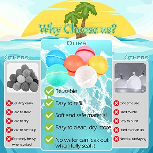 - 🌴 REFILLABLE&SELF SEALING BALLOONS: Summer quick fill water balloons adopt new technology, each balloons have 16 small powerful magnets, do not need faucet, seal tightly, save time and effort. Just sink the balloons into the water, it will be quick filled in 1-2 seconds, and it will open automatically when colliding or squeezing