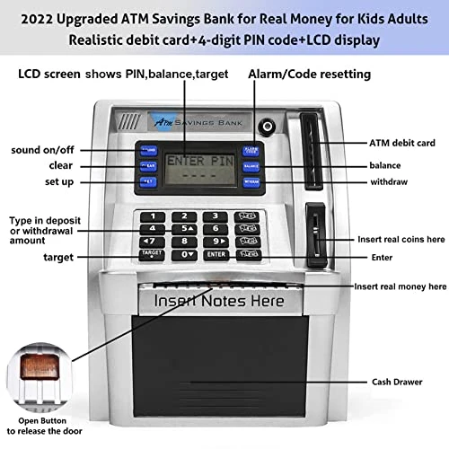 - ATM Piggy Bank Targets Setting–press balance key to check your balance,press target key,children could check the LCD display to see the amount that is still needed to reach their goals.An interesting way to teach your boys or girls how to save money and track their savings. Kids atm machine also features time clock with 12/24 hour format and alarm,calendar and savings target setting.