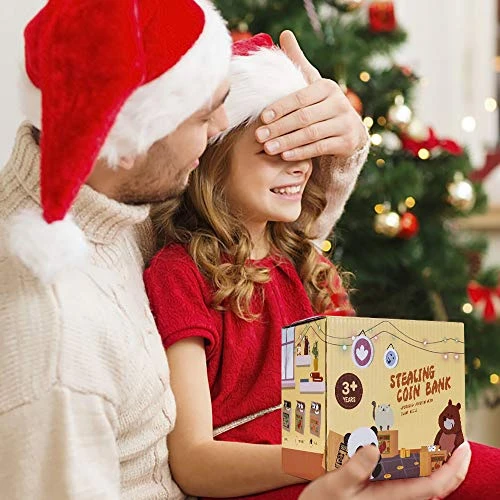 - 💖【Large Capacity】 – This Stealing Money Bank measuring 4.7*4.1*3.7 inch, work on all US coins can hold approximately 30 or 40 coins. This smart coin bank can be your first choice to teaching kids how to save money.
