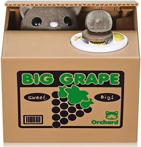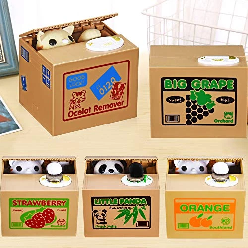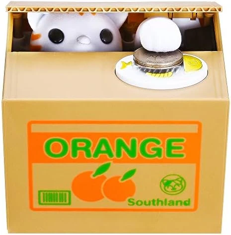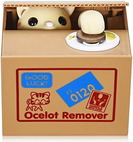 - 👉【How do they steal】 – Ask your little kid to put one coin on the top of button then press it. The kitty of this automatic stealing money bank would head up and steal it. You can find more info about how this kitty “steal” money from the description.
