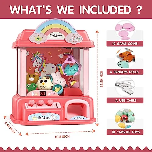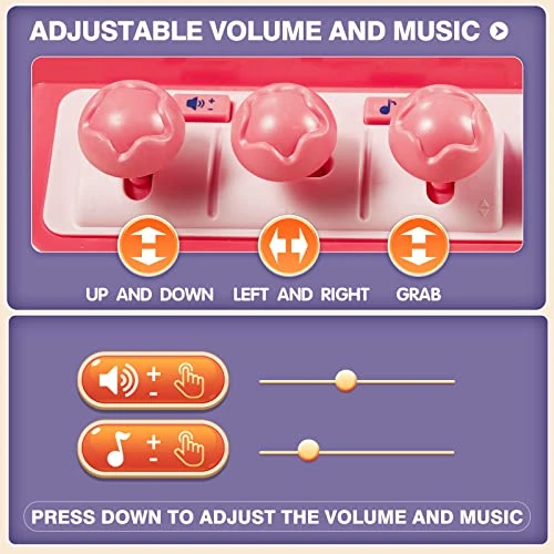 - EXPANDING NEW GAMEPALY PRIZES: In addition to the six plush toy we provide, you can put any item you want to grab. Small toys, kids party favors, candy. Use the included token coin to activate the crane game, then use the 3 joy control sticks to control the single claw to move it up, down, left and right to pick your prizes. 60s countdown screen to create a tense game atmosphere.