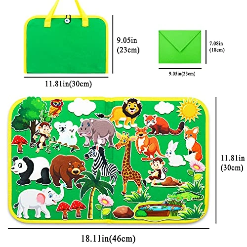 - Portable Felt Busy Board, Made of superior flannel, flexible with no hard corners, Great Travel Toy Choice: The busy board measures approx 17 * 11inch. The size of storage bag is 9 * 7 inch.