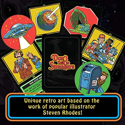 - INSIDE THE BOX: 100 Cards, 10 Stranger Tokens, 40 Kid Tokens, 1 Saucer Coin, 1 Double-Sided Game Board, 1 Rulebook