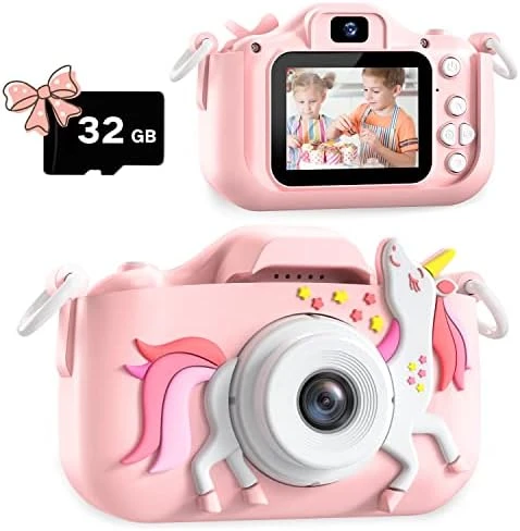 - 【Why you Choose Our Product】It comes with: 1x Kids Camera with Cartoon Protective, 1x Exquisite packing box, 1x USB Charging Cable, ,1x 32GB Memory Card, 1xCard reader, 1x Hanging Lanyard, 1x User manual. If you have any questions with our products or service, please contact us anytime, and we will provide you with perfect solutions as soon as possible.