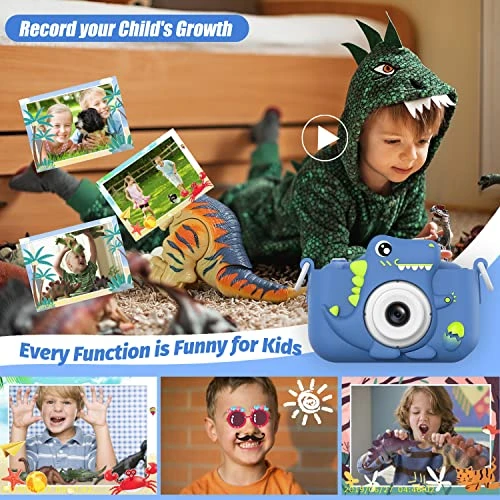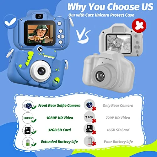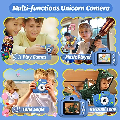 - 【Specially Upgraded Design for Children】Upgraded to dual-camera configuration, Easy to take selfies. Just open the switch key to enjoy the fun of taking photos. The cute cartoon silicone casing provides the kids camera with nti-drop design, allows kids to enjoy happy and freedom photography moments without worries of broken. The camera for kids also specially designed a durable lanyard for portability, children can hang the camera on their neck.