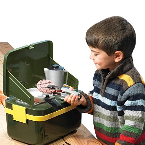 - Includes coffee pot, pan, and 4 utensils; all pieces are plastic and store neatly in a carry-along case