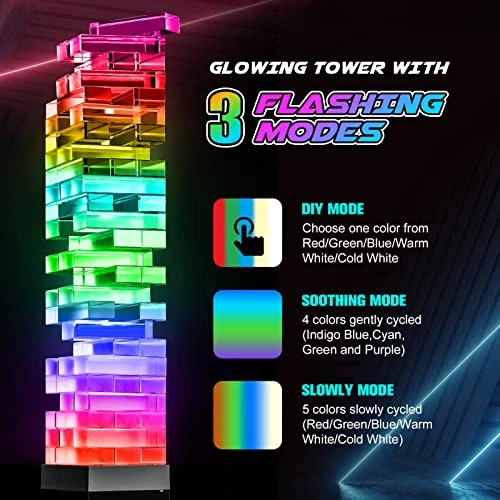 - 👍 Durable and Portable: Comes in a sturdy box, these stacking blocks are firmly surrounded by layers of white foam for secure storage, easy to carry on camping trips or travelling.Additionally,this glowing tower can be powered by 3*AAA batteries (not included) or USB cable, you can repeat play the stacking games anytime & anywhere.