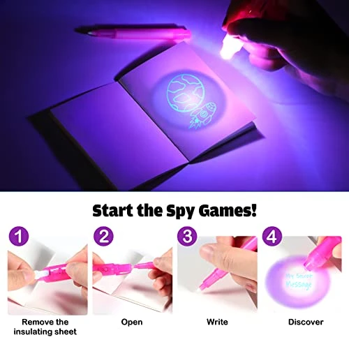 - SUPER FUN PARTY FAVORS – These glow in the dark party supplies are an ideal and unique kids party favors sets for boys and girls age 3+. Perfect spy gear for games like the escape room, detective games, riddles, skin tattoos, etc. Whether you’re looking for a game for your kids or organizing a spy party, this invisible ink pen set will provide hours of entertainment.