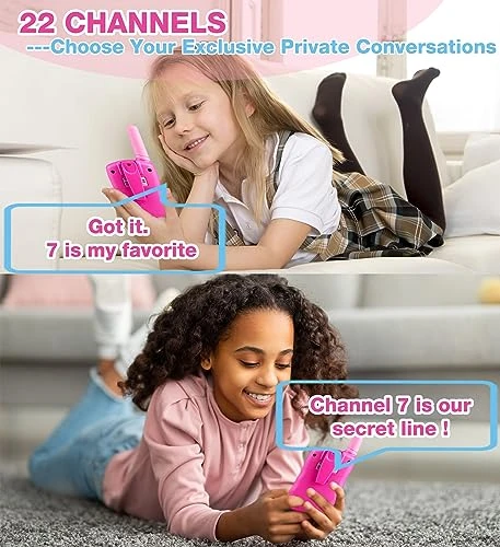 - 𝟐𝟐 𝐂𝐇𝐀𝐍𝐍𝐄𝐋𝐒 — 𝐂𝐡𝐨𝐨𝐬𝐞 𝐘𝐨𝐮𝐫 𝐄𝐱𝐜𝐥𝐮𝐬𝐢𝐯𝐞 𝐏𝐫𝐢𝐯𝐚𝐭𝐞 𝐂𝐨𝐧𝐯𝐞𝐫𝐬𝐚𝐭𝐢𝐨𝐧𝐬. With a choice of 22 channels on girl walkie talkie, kids can select the perfect channel for each interaction. Enjoy clear, interference-free communication and connect securely with ease.