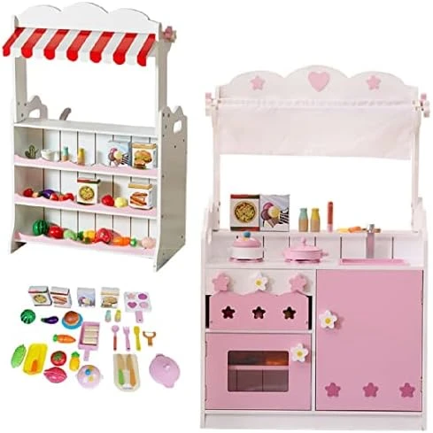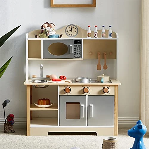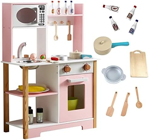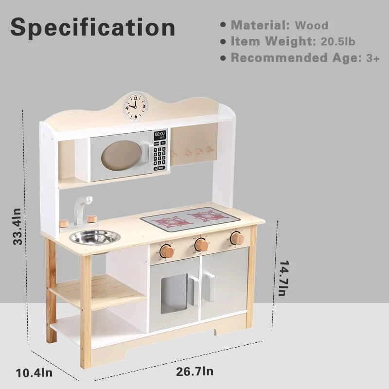 - 【Safety & Nature】: Our kitchen playset is made from healthy material and All have passed safety tests and reached the standard. Made of premium MDF board and solid wood, sturdy and durable construction. High-quality Craftsmanship, every edge of the play kitchen is polished and processed, easy to clean.