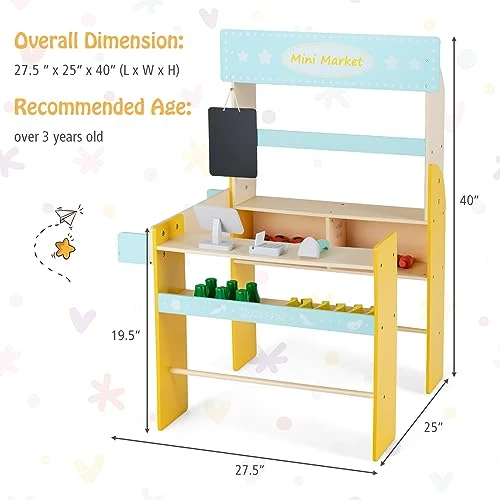 - 【Safe & Durable Grocery Playset】The kids marketplace grocery store toy is ASTM and CPSIA certificated. Thickened board and solid wood accessories promise longer service time while reinforced structure highly improves stability. Together with smooth round corners, higher safety is well ensured.
