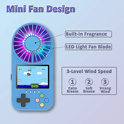 - 🎮 Game Console with Fan Design: Our game console with unique mini fan design provides a good game experience especially in summer, playing games while getting cool, thoughtful 3-level adjustable wind speed meets your different needs: 1-calm breeze(5m/s), 2-soft breeze(8m/s), 3-strong wind(12m/s), fan design with built-in fragrance pieces lets you enjoy not only the cool wind but also the fragrance, LED light fan is so cool and attractive.