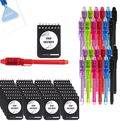 - 25 Spy pens Included – Write secret messages using invisible ink, messages remain invisible until UV light (included on cap) is shined on written text