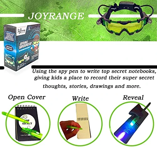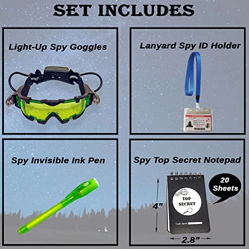- BONUSES: Each Spy goggle comes with 3 Spy Gadget Bonuses that will add extra fun and will keep children entertained for hours on end, 1. invisible ink pen, 2. Top-Secret notepad for secret messages, 3 Lanyard ID Spy Card Holder With Spy Id Card.