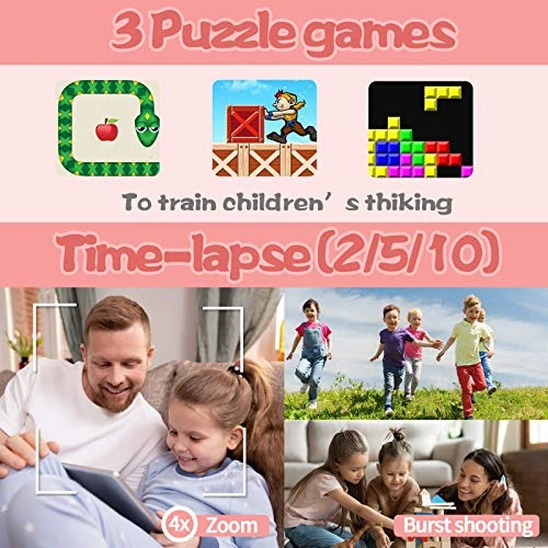- ♪【Nice Gift for Kids】This cost-effective kids camera has 5 simple games built in, with a cute design and unique shooting features, children will love to play. If you’re looking for a birthday gift, Christmas present or other holiday gift for your kids, consider our affordable kids camera that will make you and your child feel satisfied!