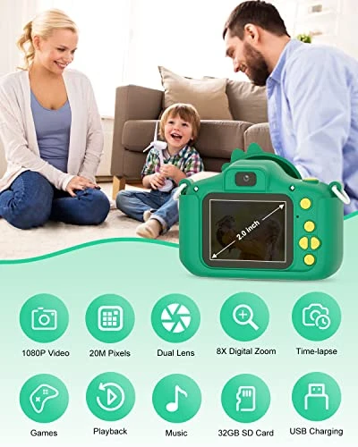 - Multi-function & 32GB High Capacity: In addition to taking photo, recording and playback, the upgrade new kids digital camera for kids comes with more functions, such as burst shooting, time shooting, 28 filter effect, puzzle games to inspire children’s imagination and creativity! Extra 32G SD card allows to store thousands of photos. No need to worry about running out of storage anymore!