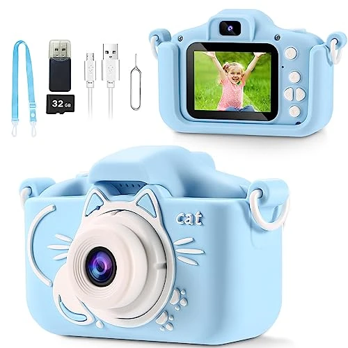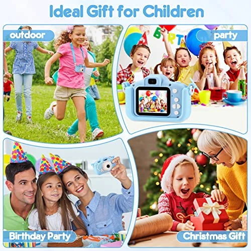 - Upgrade Kids Camera:2-inch super IPS screen kid camera, 8 MP photo and 1080P video.3 kinds of time-lapse, 8x digital zoom ,Built-in 600mAh large-capacity battery that works for 2-3 hours, charging for 1-2 hours, Automatic shutdown time can be set,Come with 32GB SD card and,a card reader and USB charging data cable.