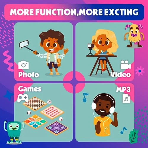 - Drop-resistant Tiny Camera – The digital camera for kids is protected by a soft silicone kid camera cover. It effectively helps to prevent the kids camera for girls from dropping. The kids digital camera itself is made of non-toxic plastic, which is skin-friendly to kids.