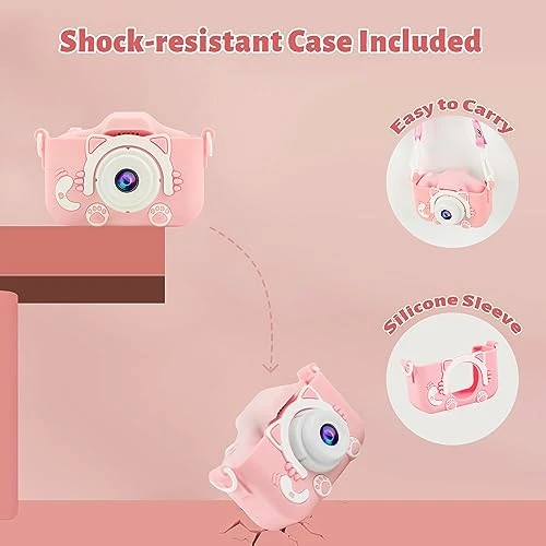 - 📷【Portable & Lovely Cat Silicon Case】The pink camera with a rope-hanging silicone shell, High quality silicone protects the camera from drops, making the kid camera more durable. Cat mini camera just suitable for the little hands of boys and girls.