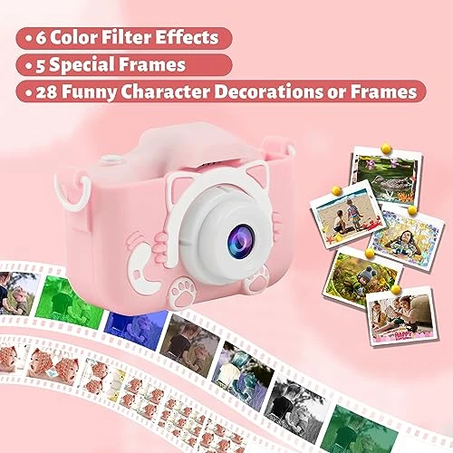 - 💗【Funny Toys Camera for Kids】Multifunctional game kids’s toy camera has 34 kinds of cute photo frames, 6 filters and 3 kinds of puzzle games (snake, push box and Tetris). Kids Camera can be used as a gift for little girls aged 3-10 years old, evelop the creativity and imagination.