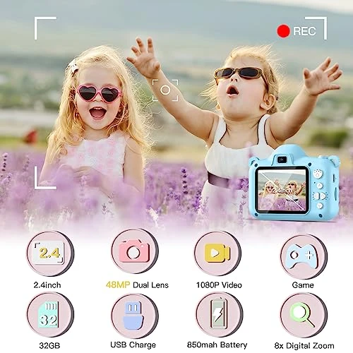 - 🐨💙📷【850mAh Battery & 32GB High Capacity】 Built-in 850mAh powerful battery life that works for 2-3hours after charging for 1-2 hours. The automatic shutdown function to preserve battery life if no continuous operation. Come with 32G memory card to store thousands of photos, keep on recording happy moments of the childhood of your children.