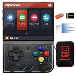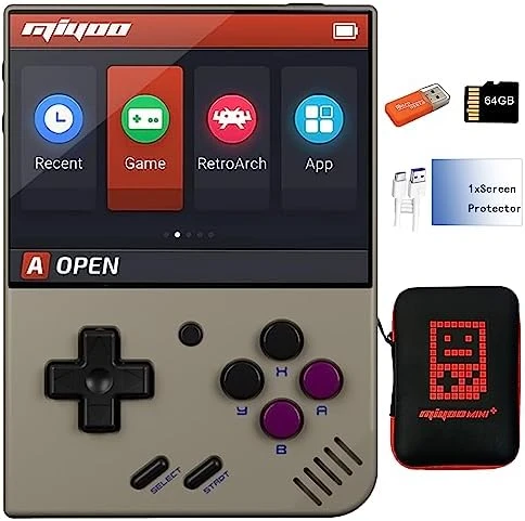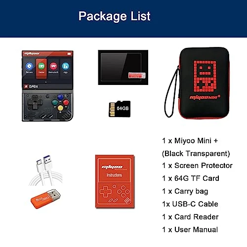 - Package Contains: 1 x Miyoo Mini Plus Game Console(Black Transparent), 1 x Screen Protector, 1 x 64G TF Card, 1 x Carry bag, 1 x User Manual, 1x USB-C Charging Cable, 1 x Card Reader