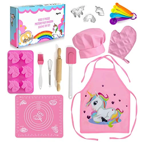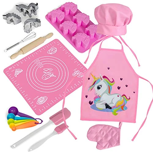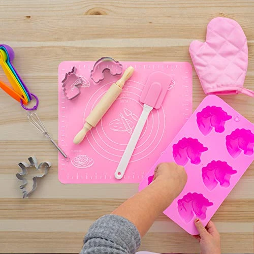 - 🌈 17 PIECES IN ONE SET – Our set comes with 17 baking tools including a unicorn mold, rolling mat, rolling pin, measuring spoons, cutters, hand mixer, brush, mitt and even a cute chef’s hat!
