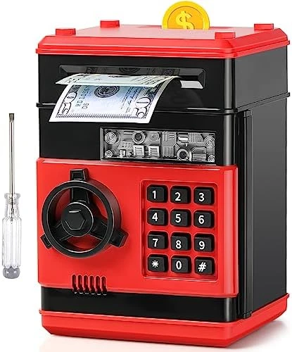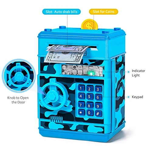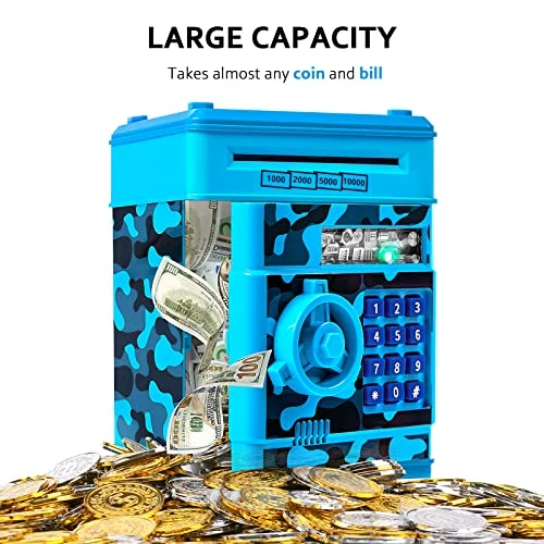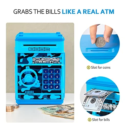 - 💰【For All US Coins And Bills 】Large capacity money safe for kids, plenty of inside space for storage. A slot for coins and a slot for bills, this money saving box takes almost any coin and bill, ATM piggy bank for real money,l large enough to store some small trinkets too. Cool stuff for boys girls as girls boys toys gifts ideas.