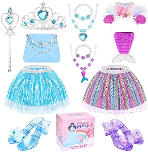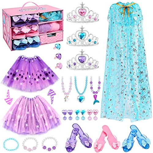 - âśż Princess Pretend Play Set – It neatly holds all pairs of dress-up shoes and sparkling jewels in one safe and tidy place. Girls will feel like a little lady with her own princess shoe closet! The princess shoes dress up and jewelry set put in a neat box, which cultivate the habit of children to storage and sort out their own things.