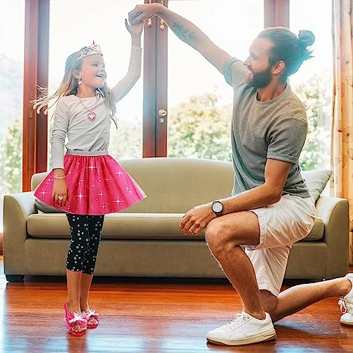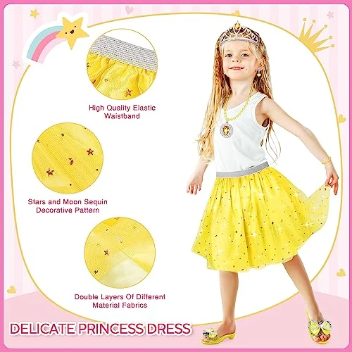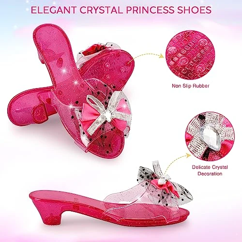 - Dress up shoe for Girls Toys – Included in this enchanting set are 3 different color skirts, 3 color toddler-sized heel princess shoes, 3 princess tiaras, 3 princess jewelry, 3 necklaces, 3 rings and 3 earrings.Little girls can choose from a selection of beautifully designed princess costumes, allowing them to transform into their favorite princess characters. The skirts are available in different colors and styles, perfect for twirling and dancing.