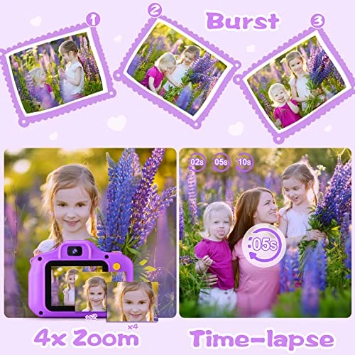 - 【Multi-functional Kids Digital Camera】This toddler camera do support burst shooting, time-lapse to meet all kinds of demand in different situation. Built-in puzzle games bring kids more pleasure. Built-in rechargeable battery enable this girls camera be charged easily with a USB.