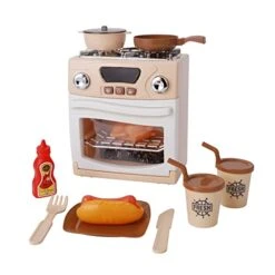- Toddler kitchen playset: This children’s oven toy set includes an oven, a pan, a pot with a lid, ham, tomato sauce, two cups, and a knife and fork.