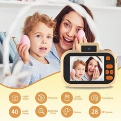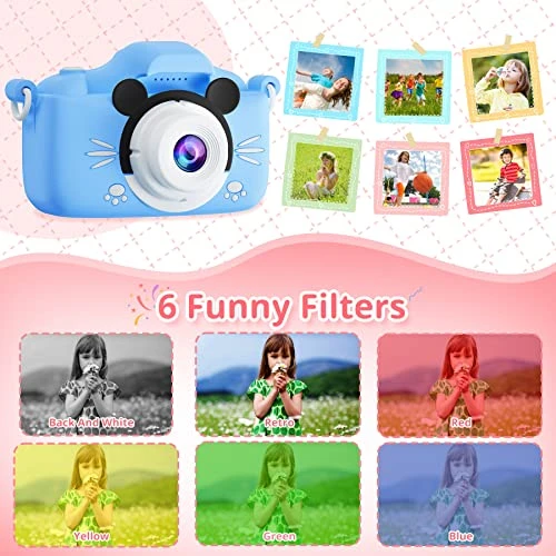 - 【Multifunctional Kids Camera】:Multifunctional Kids Camera:This Kids video camera has complete functionality, supports photo shooting, video recording,time lapse, fun photo frames. Built-in puzzle games. this children camera has 28 funny frames and 6 color scenes to select, so your children can use their imagination and creativity to realize the dream of a small photographer.