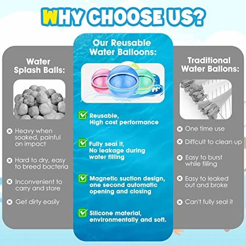 - 🟢ECONOMICAL: While traditional water balloons can add up in cost, reusable water balloons are a one-time investment that can be used over and over again. This summer toys can help save money in the long run while still providing hours of fun and entertainment for the whole family.
