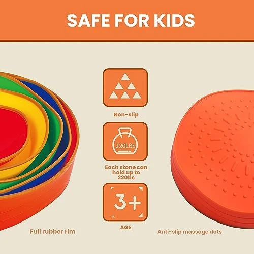 - Safe and Non-Slip Design: Each stepping stone features a non-slip surface and rounded rubber edges for added safety during play, suitable for any ground surface indoors or outdoor. And the raised massage bumps that provide tactile stimulation for kids.