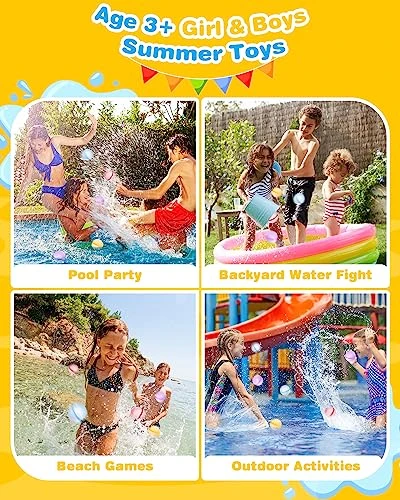- 🤽【Quick Fill Self Sealing Water balloon】No tap,just open-fill-seal, easy to fill water, one second to make a pool bomb, gently squeeze to splash water. for backyard, pool party, beach, outdoor, water park, bath.Let the summer fun begin with water balloon!
