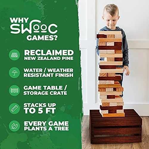 - 🔝 60 GIANT BLOCKS: That’s 6 extra blocks versus the classic board game (Hint:Rhymes with Zenga). Starts over 2.5ft tall (24in blocks and 8in game table = 32in total). Max height of 5 ft during game; Each block is (L) 7in x (W) 2.31in x (H) 1.12in