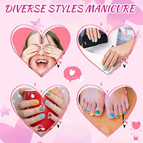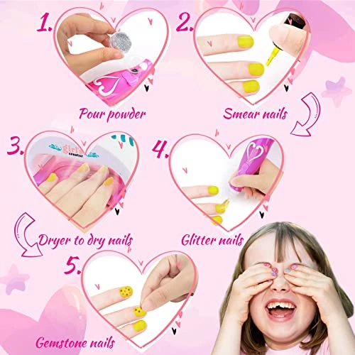 - 🤙【Cute Nail Polish Art Set for Girls】🤙The Nail Art Set is a craft toy for girls ages 6-12. It’s easy for your child to play with. Here are the steps: Choose your favorite nail polish color (three styles: pink, green or yellow) and apply it to your nails DIY. Dry with a nail dryer. Decorate your nails with sticky nail gems. A complete range of unique nail art styles. In the process, your child’s hands-on skills and imagination will improve.