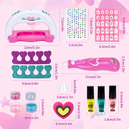 - 👏【5 6 7 8 Years Old Girls Toys Set】👏Kids Nail Polish Art Toy is a fashion DIY design game for girls 5 years old and up. In the game, girls can design a variety of nail art styles, and the unique styles reflect the personal creative style of young girls. Satisfy the unique inner thoughts of girls and can bring more happiness to girls aged 6-12. Playing with nail polish toys can give them unlimited imagination, allowing your child to use their brains and create colorful finger nails.
