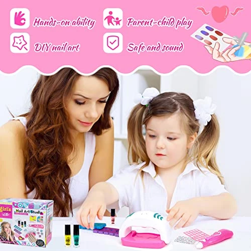 - 🙌【Makeup Present for Kids to Play】🙌The nail polish in the toy is water-based nail polish, so when a girl wants to change the color or style of her nails, she can easily peel off the polish and dry it quickly (no nail polish remover needed) without harming your child’s nails. Little girls are able to explore fashion and beauty. Throw a birthday party and host a playdate that includes a manicure and pedicure.