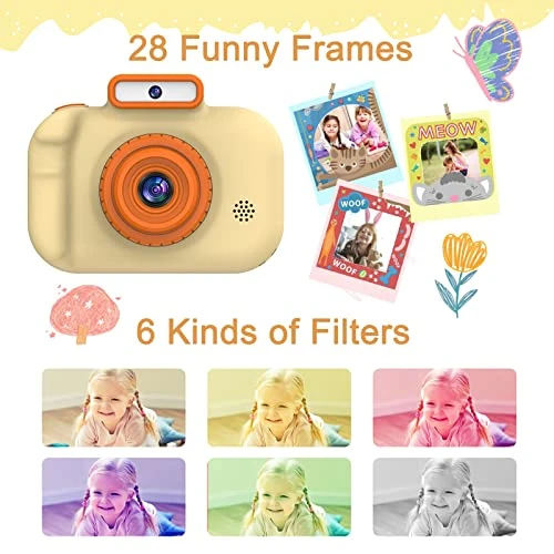 - 【Multifunctional Kid Camera】The upgraded kids camera has more features including photo shooting, self-timer, video recording, music, puzzle games and more. The toy camera includes 28 cute frames and 6 basic filters and supports continuous shooting, recording and time-lapse photography to meet various needs in different scenarios.