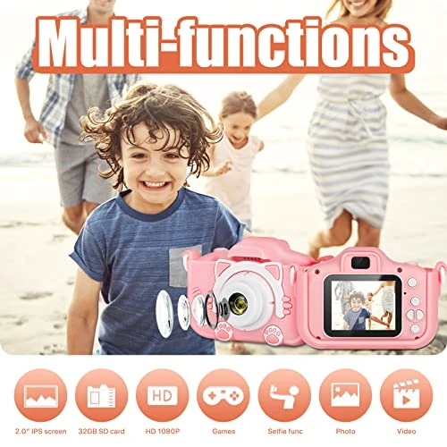 - 📷【Built-in Rechargeable Battery & 32G SD card】Built-in large capacity lithium battery can continuously taking photos for 2-3 hours after full charged. Kids digital camera with large 32GB SD card which can store 5,000 pictures.