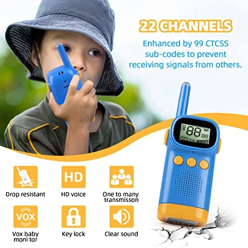 - 【Durable and Safe】The shell of the kids’ walkie-talkies adopts high-quality ABS material, which is anti-fall and durable. This set has a lockdown function, so it’s difficult for kids to change channels. Each channel with 99 privacy codes makes it more secure to use. With double buckles, it is not easy to remove the batteries. They are the best stem toys for 3-12 year old boys and girls.