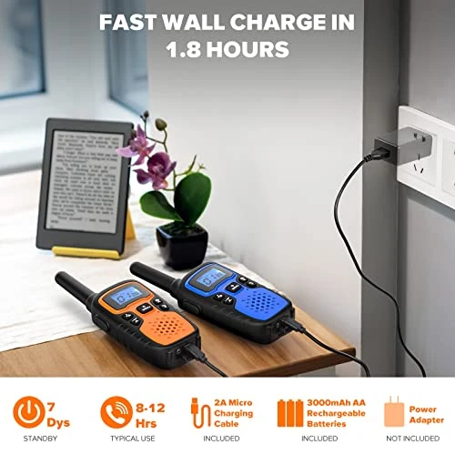 - WHAT YOU GET — 4*walkie talkies, 4* belt clips, 4*wearable lanyards, 12*1000mAh Rechargeable AA Batteries, 2*2 head micro USB charger cable, 1*user manual, 1*color box.