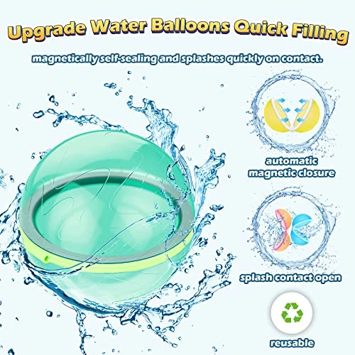 - 🔵【Safety Soft Silicone Water Ball】: The quick fill self sealing splash balls is made of super soft silicone, which is latex-free, odorless, flexible and durable. It will not hurt children during the water fight. Safe for all ages! The magnetic suction design allows you to easily fill in a bucket of water with no spillage until pressure is applied.