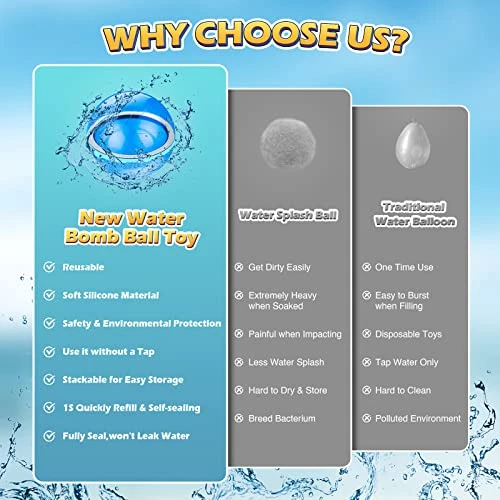 - 💦【Easy to Use】: Open the water balloons and put it into the water, it will quick fill with water and self sealing. You can throw the balls as you would any water balloon, explodes on impact, reusable water bombs achieve the same drenching effect as a balloon with no mess. Just refill, throw and repeat for endless fun and waste-free water fights!