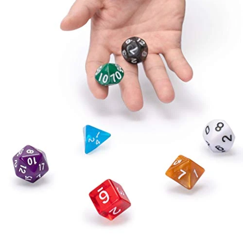 - COMES IN 7 VARIETIES: This dice set is made from durable acrylic and includes D4: 0.79 x 0.79″ (2 x 2cm); D6: 0.63 x 0.63″ (1.6 x 1.6cm); D8: 0.95 x 0.71″ (2.4 x 1.8cm); D10 (0-9): 0.87 x 0.83″ (2.2 x 2.1cm); D% (00-90): 0.83 x 0.71″ (2.1 x 1.8cm); D12: 0.91 x 0.79″ (2.3 x 2cm); and D20: 0.87 x 0.83″ (2.2 x 2.1cm)