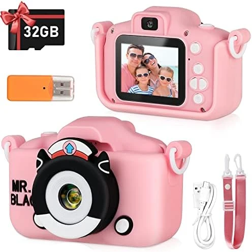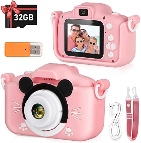 - 📷【Anti-drop Silicone & Frindly Safe Material】It comes with: 1x digital camera for kids with Cartoon Protective, 1x Exquisite packing box, 1x USB Charging Cable, ,1x 32GB Memory Card, 1xCard reader, 1x Hanging Lanyard, 1x User manual.Environmental mater ial comes with safety standard mom assured,silky touch close to the skin.Protective shockproof Shell,lightweight and durable for kids.Anti-drop design allows kids to enjoy happy photography moments without worries of broken.Also.
